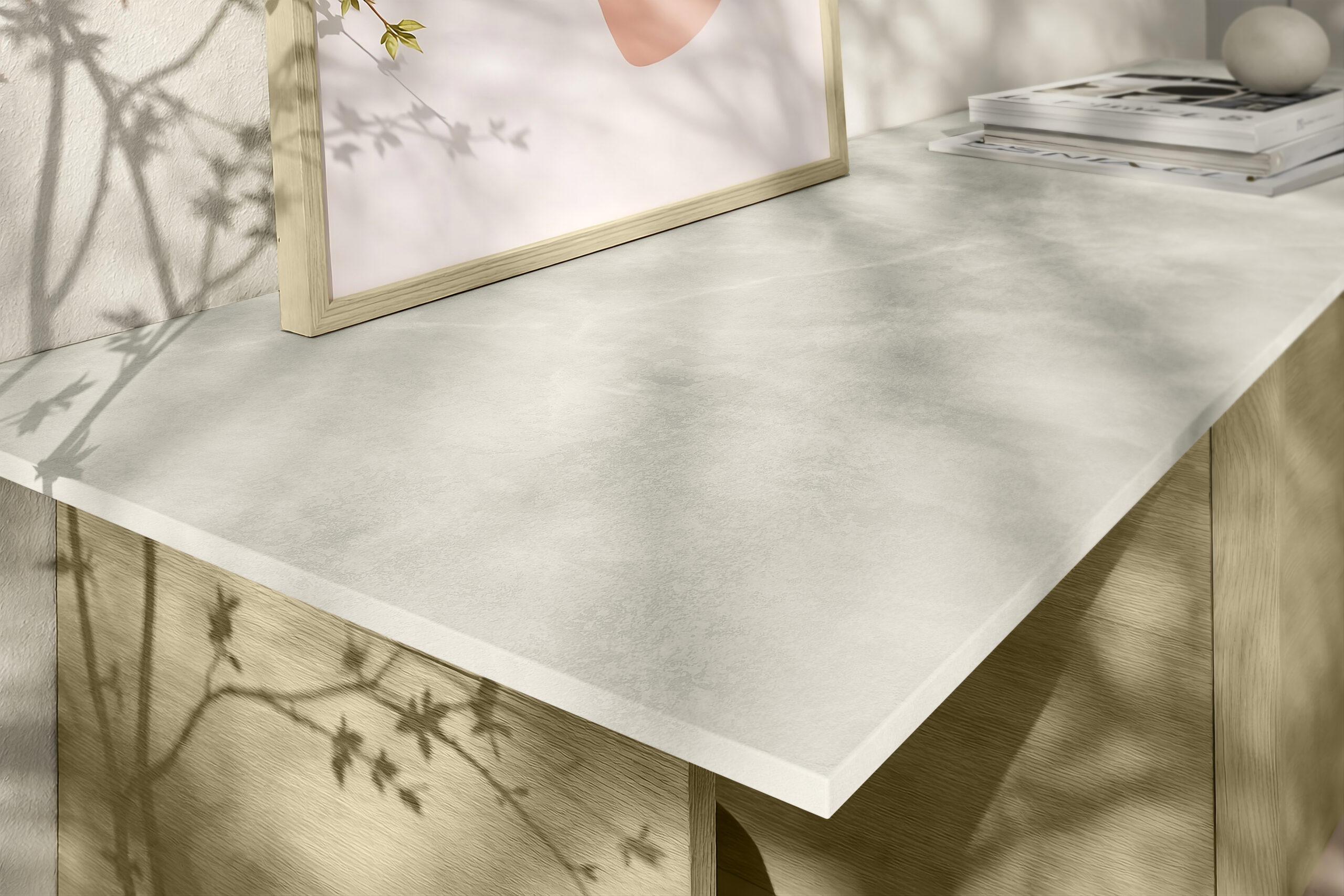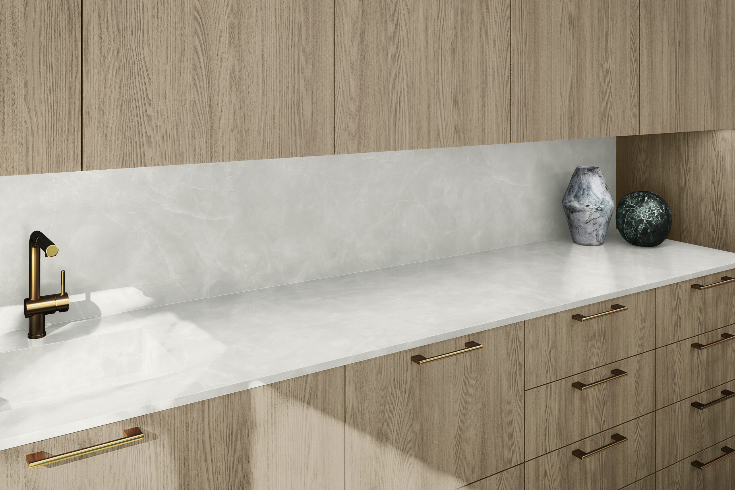 Litha is a stone design that embodies serenity and sophistication. Its light, warm tones, with soft beige and creamy undertones, convey a sense of calm and visual balance. The delicate, diffused veining adds depth without overpowering the surface, aligning with the current trend toward quieter, more elegant materials. The natural and refined appearance of Ònix makes it an ideal choice for contemporary interiors seeking brightness, spaciousness, and a feeling of well-being. Its calm aesthetic integrates seamlessly into minimalist, organic, Japandi, or Mediterraneaninspired spaces, where materials enhance the environment without overwhelming it.